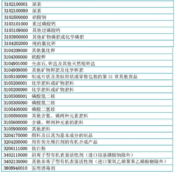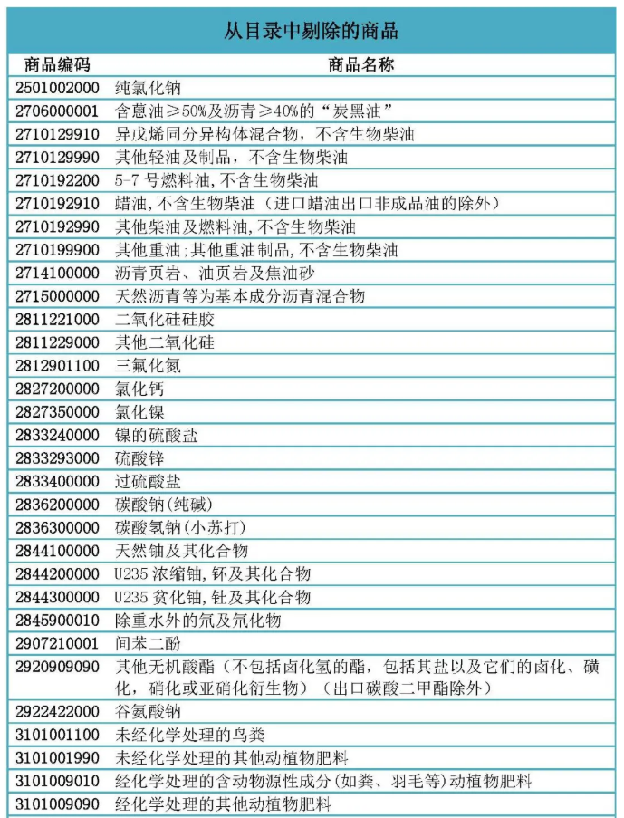 剔除了199個(gè)十位商品編碼,包括純堿、小蘇打、尿素、硝酸鈉、硫酸鉀、鈦白粉等化學(xué)品。