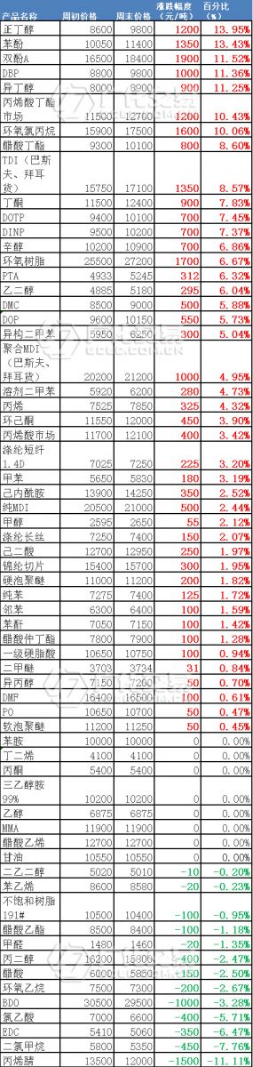 其中正丁醇周上調1200元/噸,苯酚1350元/噸,雙酚A1900元/噸,DBP 1000元/噸,丙烯酸丁酯1200元/噸,環(huán)氧氯丙烷1600元/噸,TDI1350元/噸,環(huán)氧樹(shù)脂1700元/噸。
