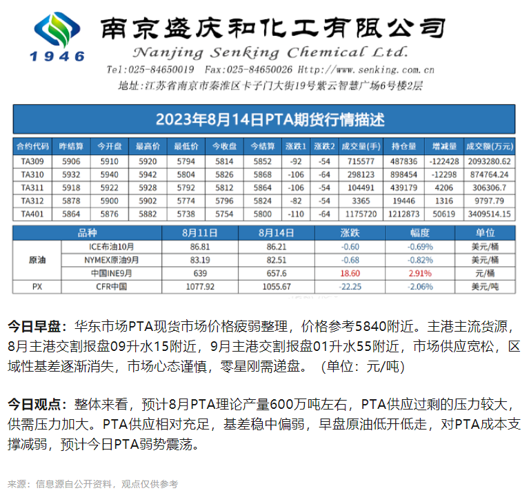 PTA最新行情通報:預計今日PTA弱勢震蕩