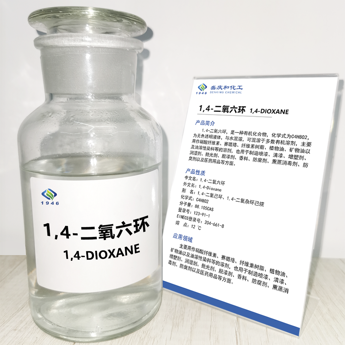 1,4-二氧六環(huán),又名1,4-二氧己環(huán),是一種有機化合物,化學(xué)式為C4H8O2,為無(wú)色透明液體,與水混溶,可混溶于多數有機溶劑,主要用作硝酸纖維素、賽璐珞、纖維素樹(shù)脂、植物油、礦物油以及油溶性染料等的溶劑,也用于制造噴漆、清漆、增塑劑、潤濕劑、拋光劑、脫漆劑、香料、防腐劑、熏蒸消毒劑、防臭劑以及醫藥用品等方面。